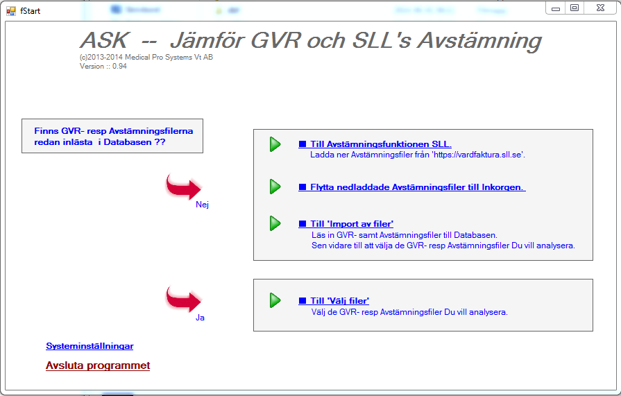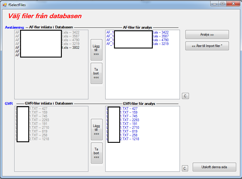 Välj filer för analys. Du jämför dina insända GVR-filer mot Avstämningsfunktionens redovisning.